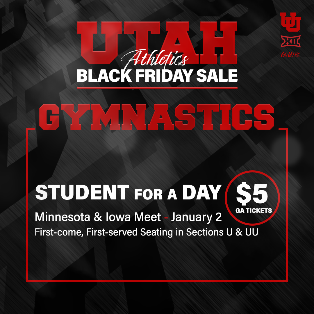 Experience Utah Gymnastics like a student! Fans can purchase $5 general admission tickets in the U or UU sections for the tri meet against Minnesota and Iowa on January 2!
